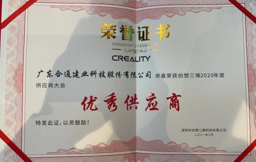 3月20日广东合通建业科技股份有限公司在创想三维公司颁奖典礼上荣获2020年度创想三维“优秀供应商”奖项,这是对合通科技产品的高度肯定!
